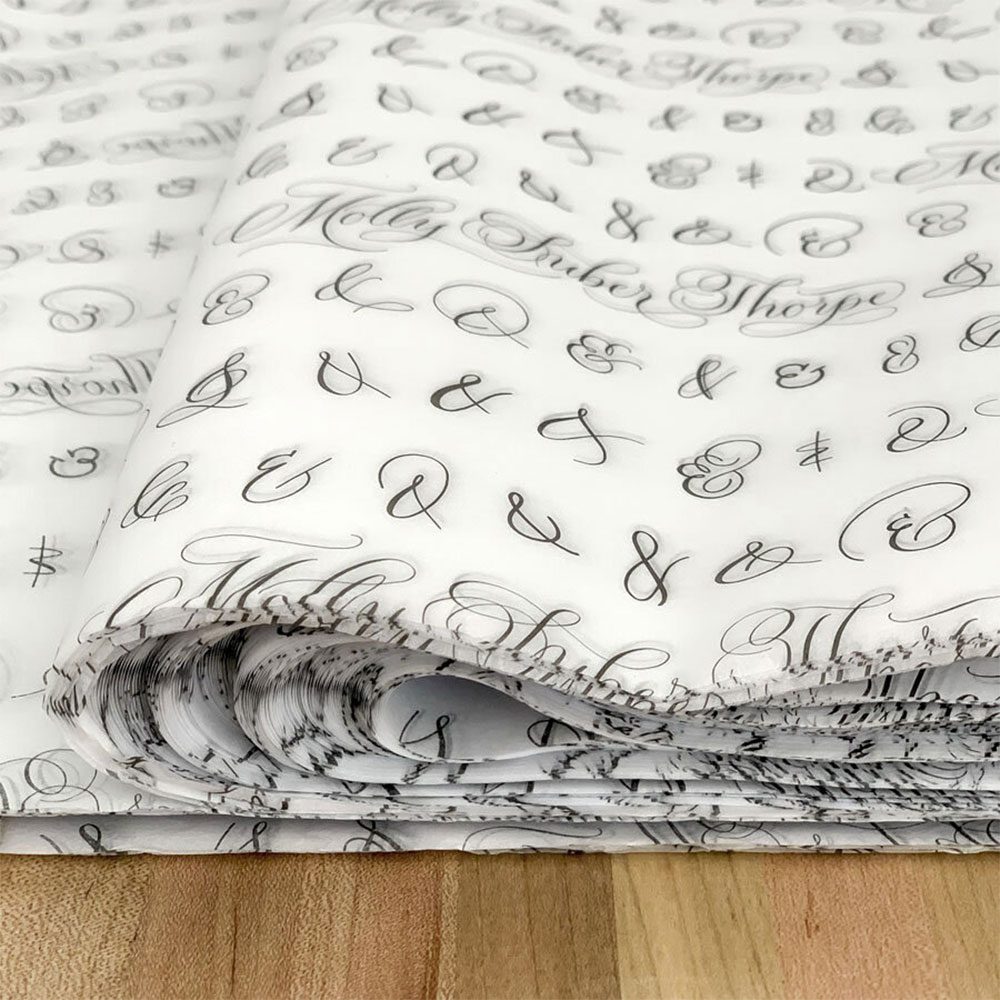 کاغذ بسته بندی چاپ اختصاصی طبق طرح مشتری در تیراژ های بالا قابل انجام است. متریال کاغذ پوستی نیمه شفاف می باشد. رنگ چاپی باید یک رنگ باشد اما آن یک رنگ میتواند رنگ ساختگی و هر رنگی طبق سفارش باشد.